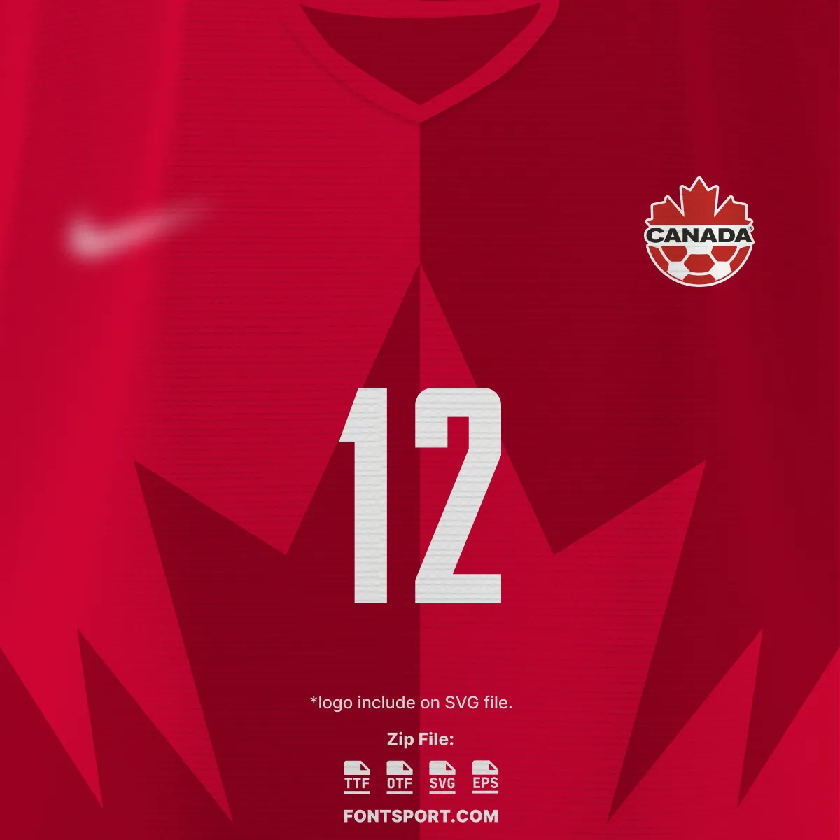 Furthermore, the font pairs naturally with the team’s striking red home aesthetic and central maple leaf theme. That makes it ideal for shirt mockups, player name sets, social graphics, and custom fan artwork that needs a confident Canadian tournament feel.