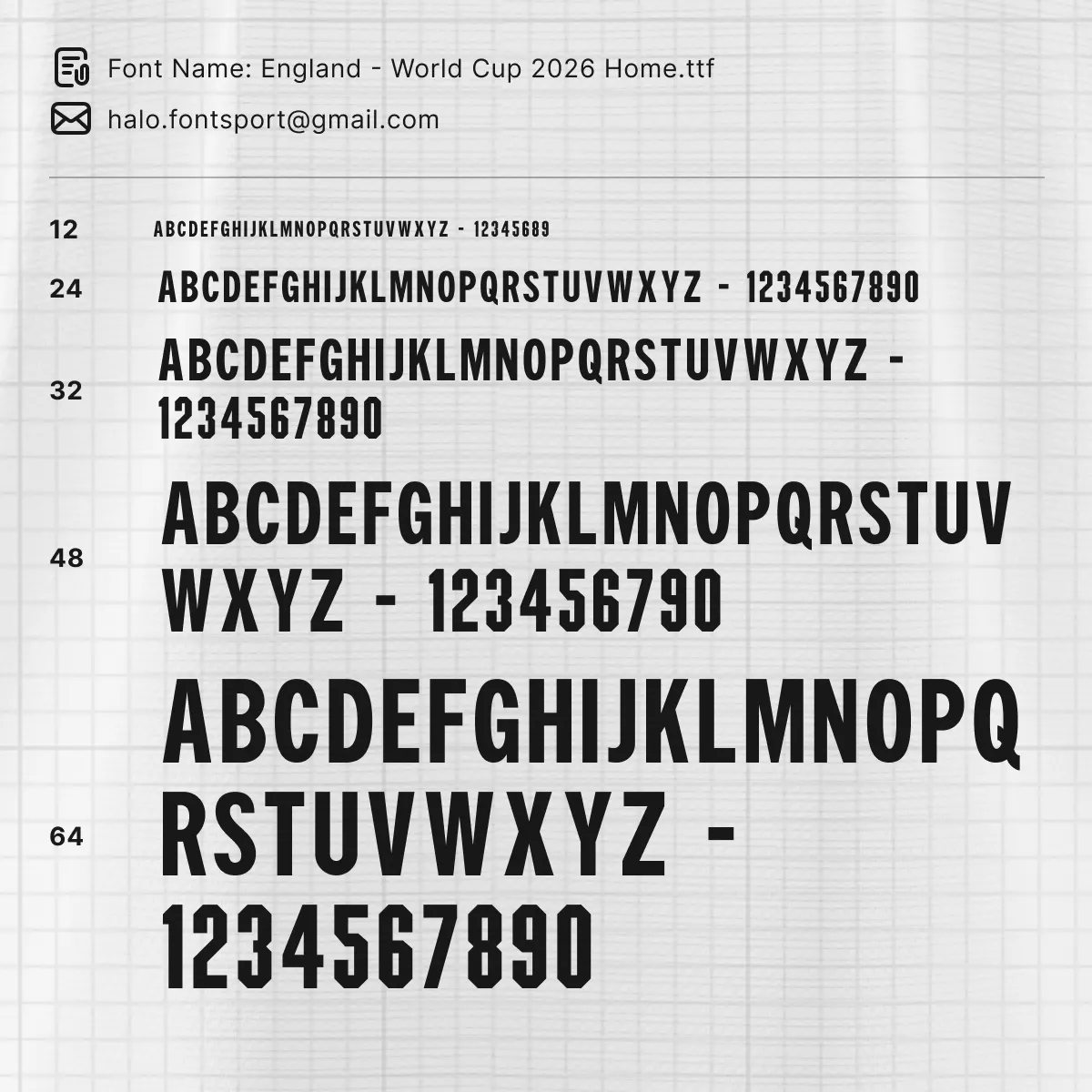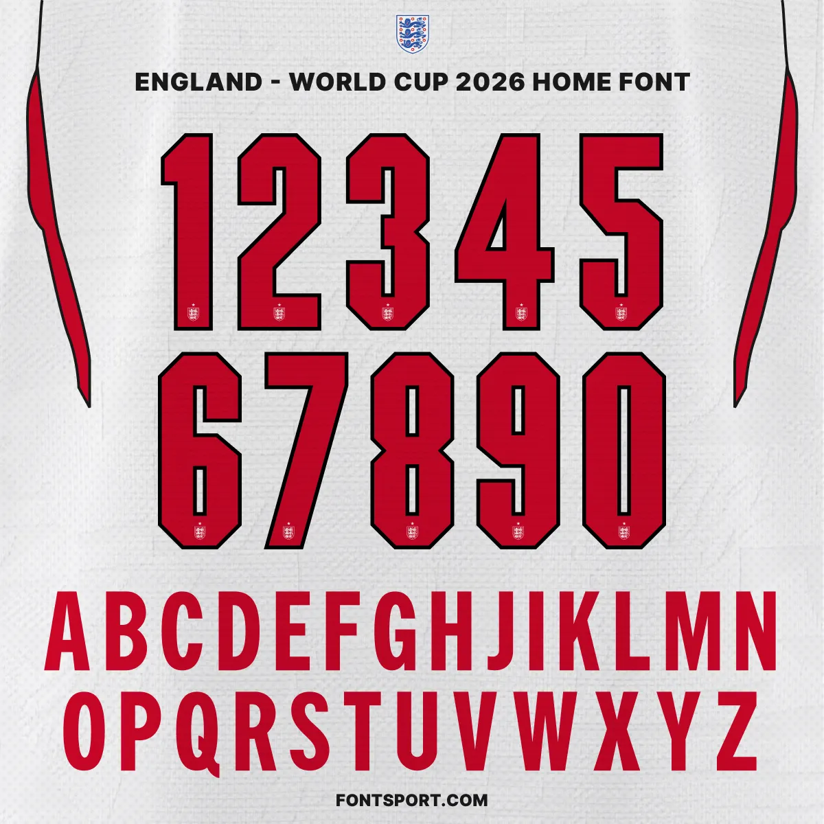 The England World Cup 2026 Home Font Kit is an independent typeface created by the design team at Fontsport. It is not produced or endorsed by The Football Association, Nike, or FIFA — but every letterform and numeral has been carefully studied and recreated to faithfully replicate the proportions, stroke weight, and visual structure of the lettering seen on England’s 2026 home matchday shirts.