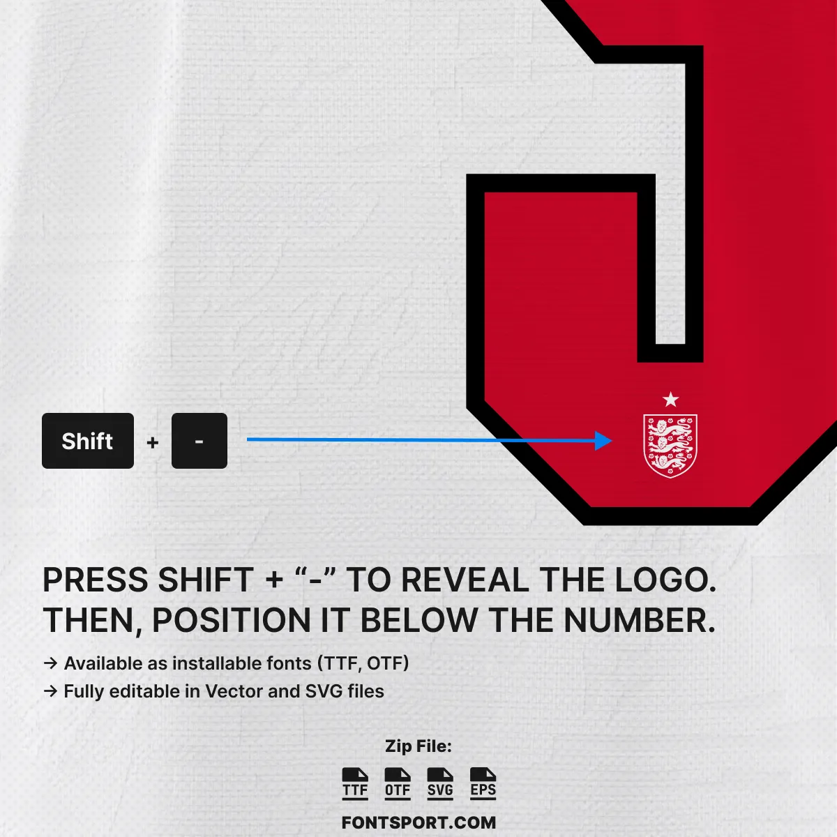 - ✅ England Three Lions crest glyph — triggered via Shift + “-“, position beneath any number for a shirt-accurate look