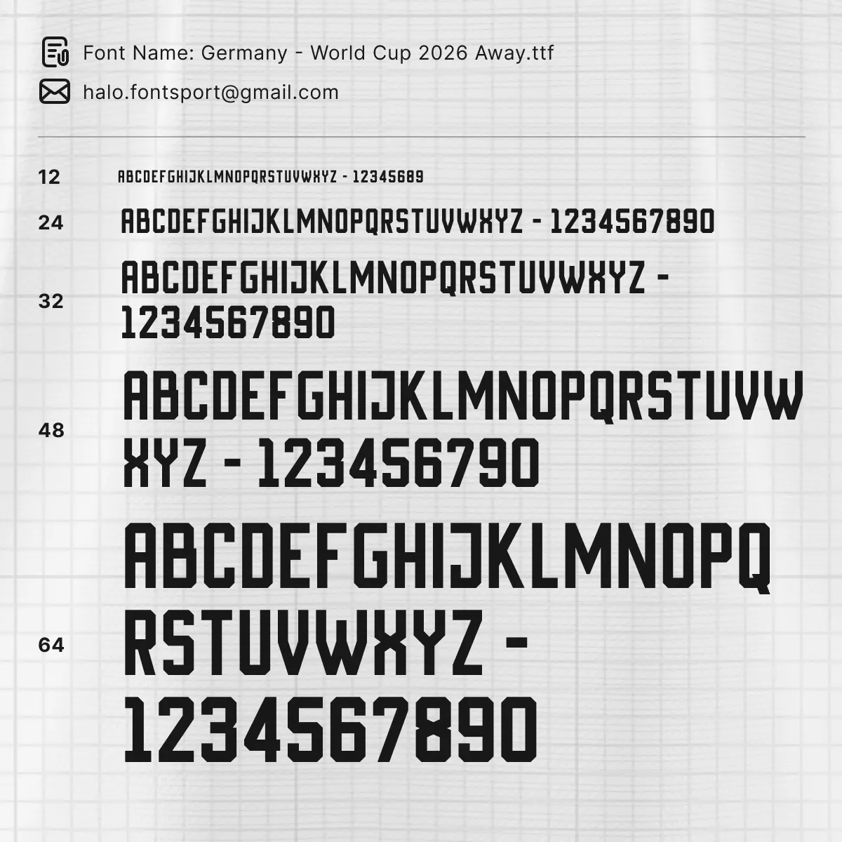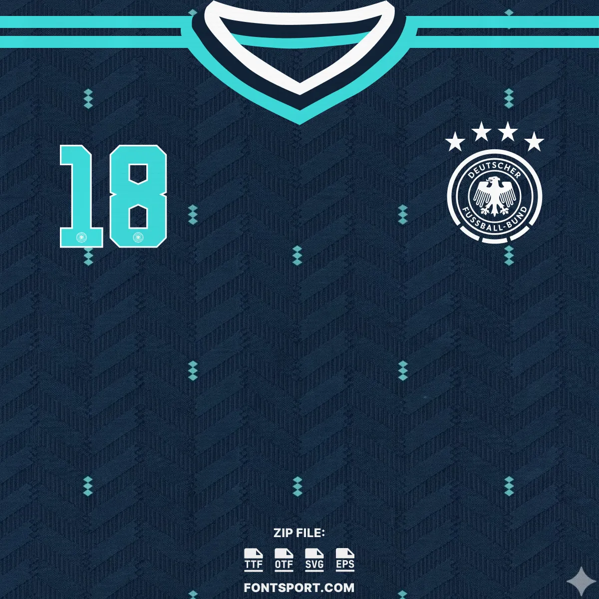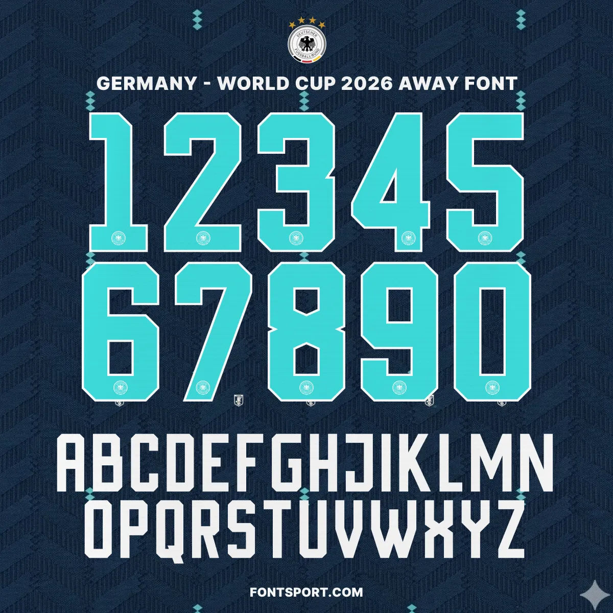 The Germany 2026 World Cup Away Font Kit is an independent typeface created by the design team at Fontsport. It is not produced or endorsed by the German Football Association (DFB), Adidas, or FIFA — but every character has been carefully studied and recreated to faithfully replicate the proportions, stroke weight, and structure of the lettering worn on Germany’s 2026 away matchday shirts.