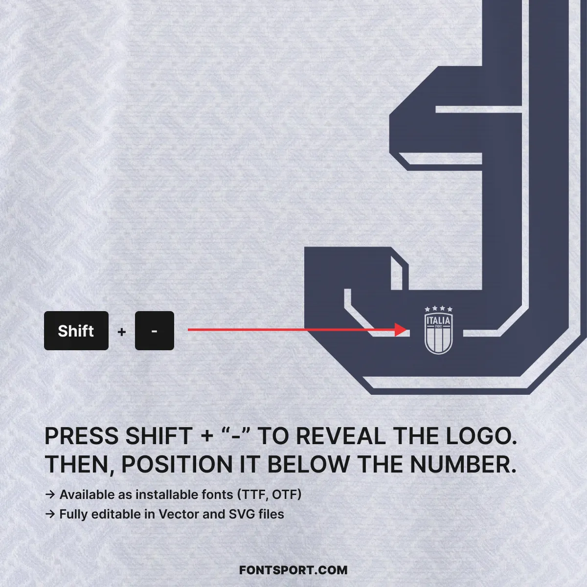 - ✅ FIGC Italia crest glyph — accessible via Shift + “-” for authentic shirt placement