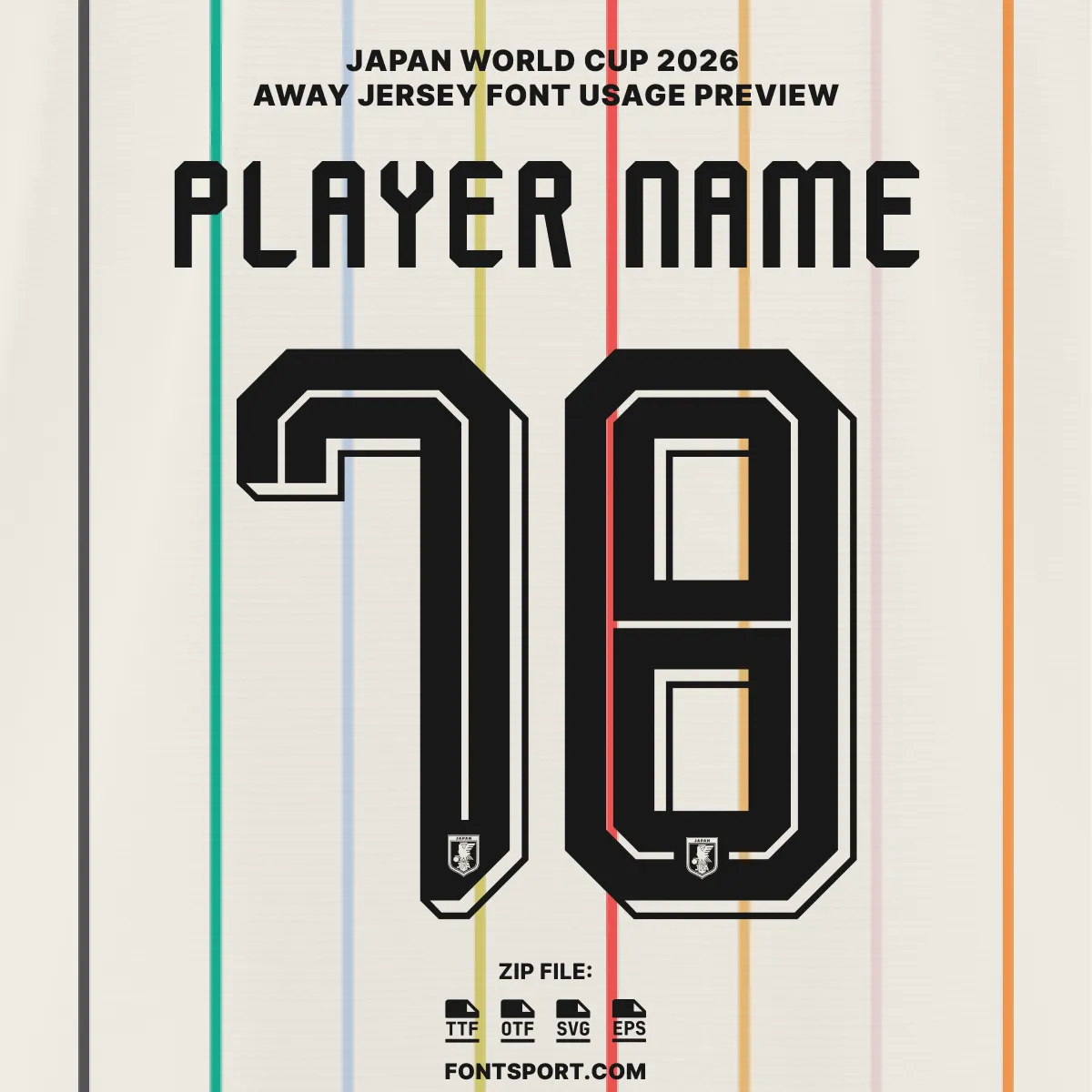 Japan’s 2026 World Cup away shirt is already being called one of the finest tournament kits in recent memory. The Japan World Cup 2026 Away Font Kit captures the letterforms and numerals worn by the Samurai Blue on that landmark strip — recreated character by character to match the weight, structure, and proportions seen on the pitch. Furthermore, every glyph has been built to reflect the bold, geometric identity of Japan’s tournament lettering for the 2026 FIFA World Cup in North America.