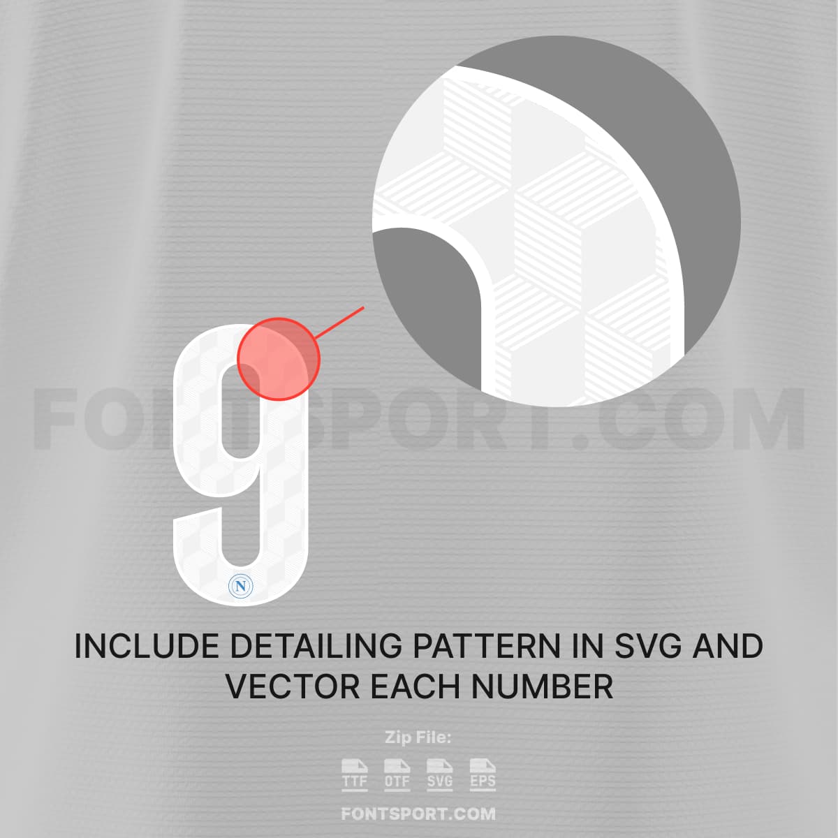 Napoli UCL 2025/2026 Font Kit full alphabet and numbers preview with unique patterned typeface for UEFA Champion League jerseys