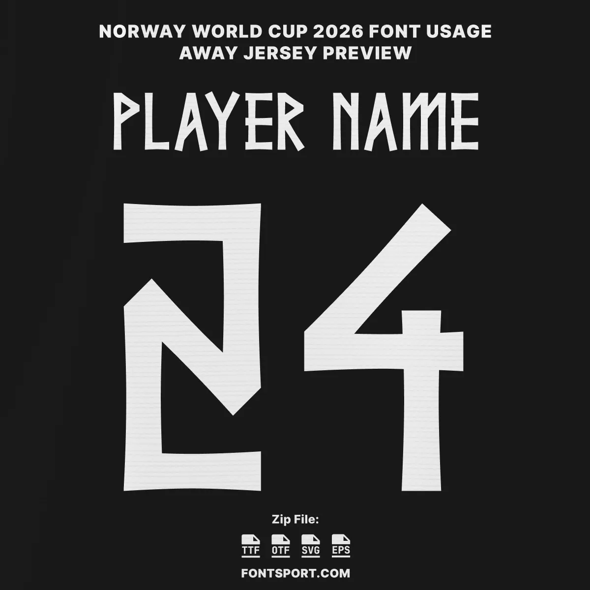 The Norway World Cup 2026 Font Kit Away is an independent typeface created by the design team at Fontsport. It is not produced or endorsed by the Norwegian Football Federation (NFF), Nike, or FIFA — but every character has been carefully studied and recreated to faithfully match the proportions, weight, and structure of the lettering seen on Norway’s 2026 away matchday shirts.