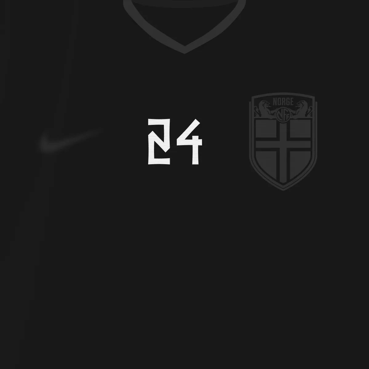The Norway 2026 Away font shares its runic DNA with the home variant but takes on a distinctly darker, more aggressive edge against the blackout backdrop. The letterforms are built from angular, geometric strokes rooted in Viking runic heritage. Sharp diagonal cuts, bold upstrokes, and deliberate structural breaks give every character a raw, almost carved quality — as if chiselled from stone rather than drawn on paper. In addition, the contrast between the stark white characters and the black shirt gives this font an intensity that few World Cup typefaces can match.
