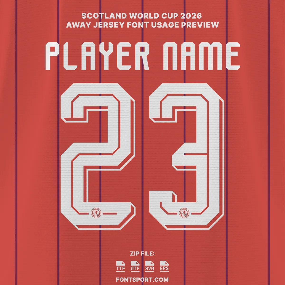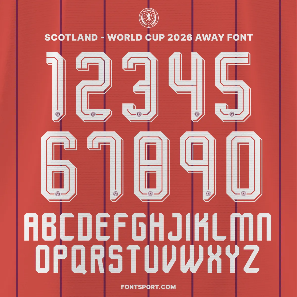 The Scotland World Cup 2026 Away Font Kit is an independent typeface created by the design team at Fontsport. It is not produced or endorsed by the Scottish FA, Adidas, or FIFA — but every character has been carefully studied and recreated to faithfully match the proportions, weight, and style of the lettering worn on Scotland’s 2026 World Cup away shirts.